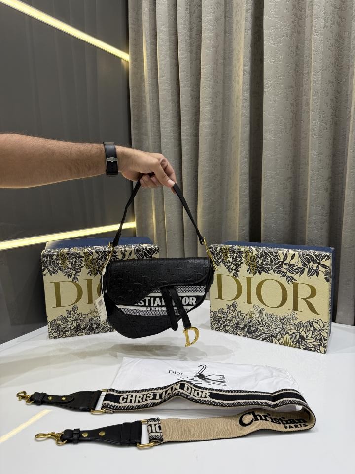 CHRISTIAN DIOR SADDLE BLACK WHITE EMBROIDERY PREMIUM WITH OG BOX